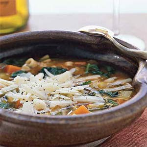 Add pasta and beans to pan; cook 10 minutes or until pasta is tender, stirring occasionally. Remove from heat. Stir in spinach, salt, and 1/2 teaspoon pepper. Ladle soup into individual bowls; top with cheese. Garnish with coarsely ground black pepper, if desired.
