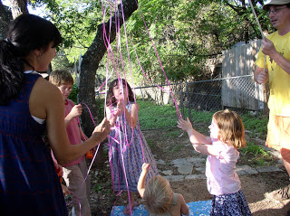 We didn’t use a stick to get the treats out of the pinata as Xi didn’t want it “hurt”, so we attached ribbons and the kids all pulled them at once.