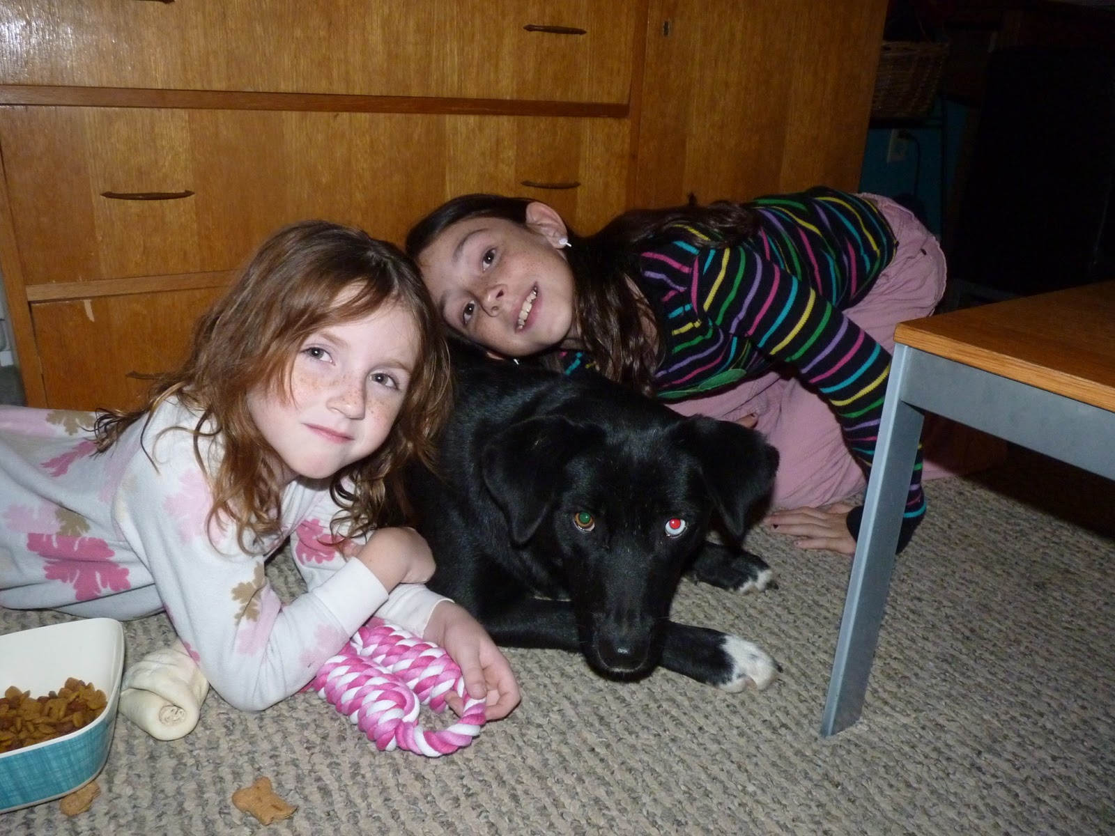 We have aquired a new little girl to our household. We are pleased to introduce you to our little beauty – Kona! She is a 4 and a half month old lab/husky/german shepherd mix and the sweetest thing on the planet! She has super intense eyes with one a pale blue and the other a bright amber/gold! She moved in on Thursday night and is quietly getting acclimated to her new home. She absolutely adores the girls, especially Xi. Neither of the girls knew this was happening. We have always told them no dogs, even up to a couple nights before she arrived. We wanted to surprise them with the best holiday gift we’ve ever given them, and man oh man were they surprised!